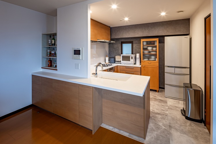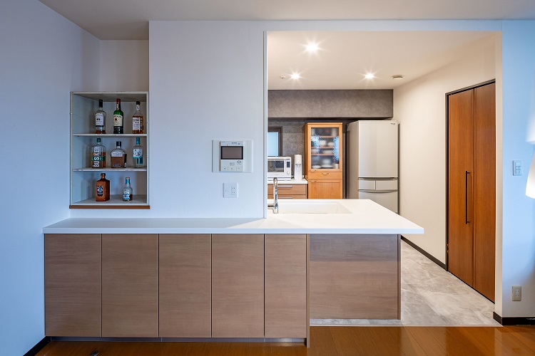 ①圧迫感のあった下がり壁を撤去し、キッチンが明るくダイニングと一体感のある空間へ。奥の壁にはグレーカラーを採用し、空間に落ち着きと奥行きをもたらしました。ダイニング側は大容量の収納を完備。シンク向かいをニースペースにしたことで、夫婦二人で立ってもストレスなく作業できるようになりました。ご主人お手製の棚には、お酒のコレクションを飾り、大人のゆとりが感じられるキッチン空間の完成です。