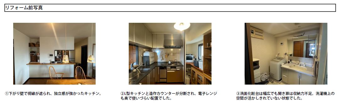 築年数の経過とともに、キッチン、浴室、洗面台といった水まわり設備の目に見える劣化や故障がリフォームを検討するきっかけでした。特にキッチンでは、ご夫婦で一緒に料理をする際、二人で立つには使いづらく、さらに日中でも暗く閉鎖的なのが気になっていました。そこで、設備の一新と同時に、二人で立ってもスムーズに動けるキッチン空間と、家族全員が快適に使える洗面・浴室空間を求め、リフォームを決意しました。