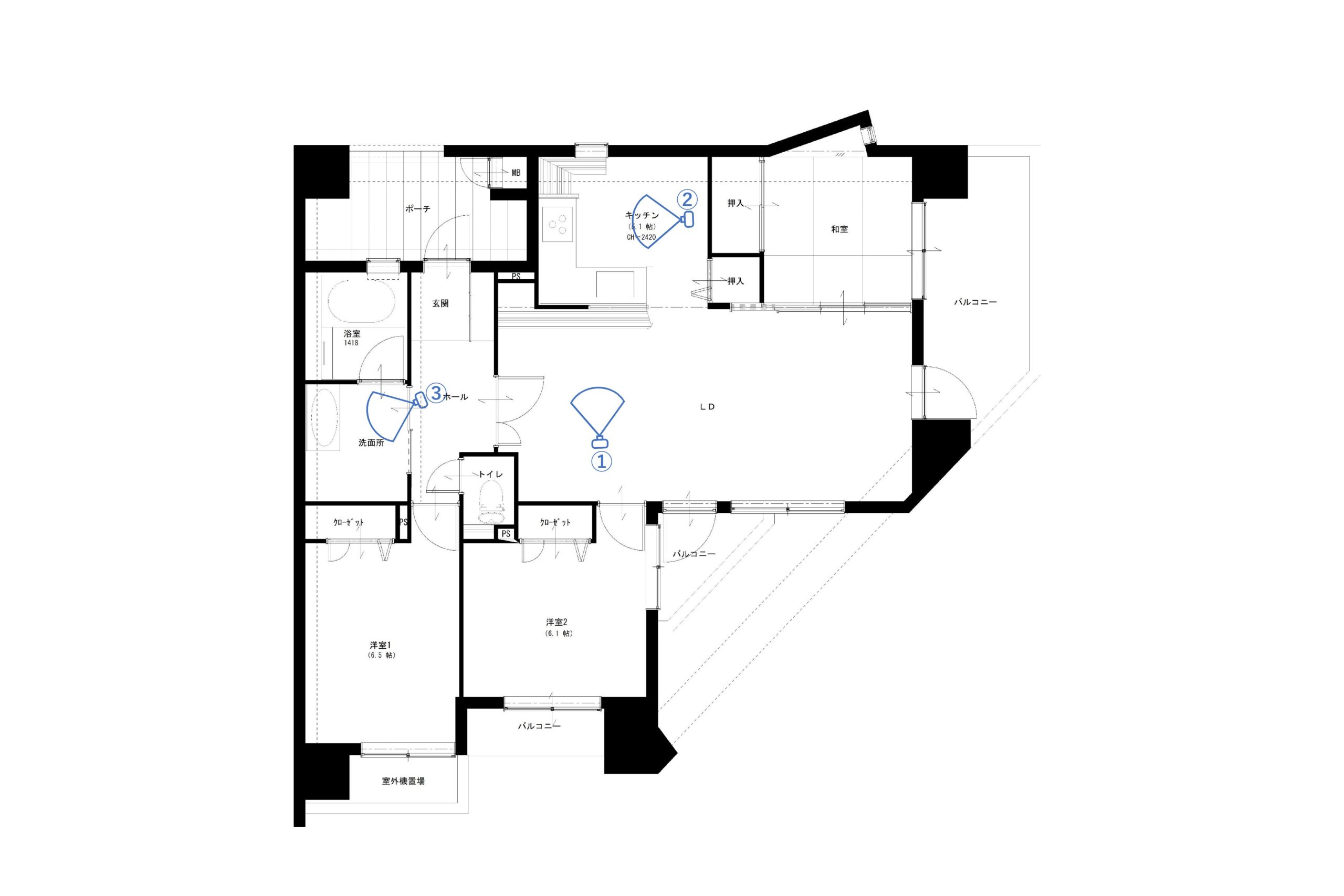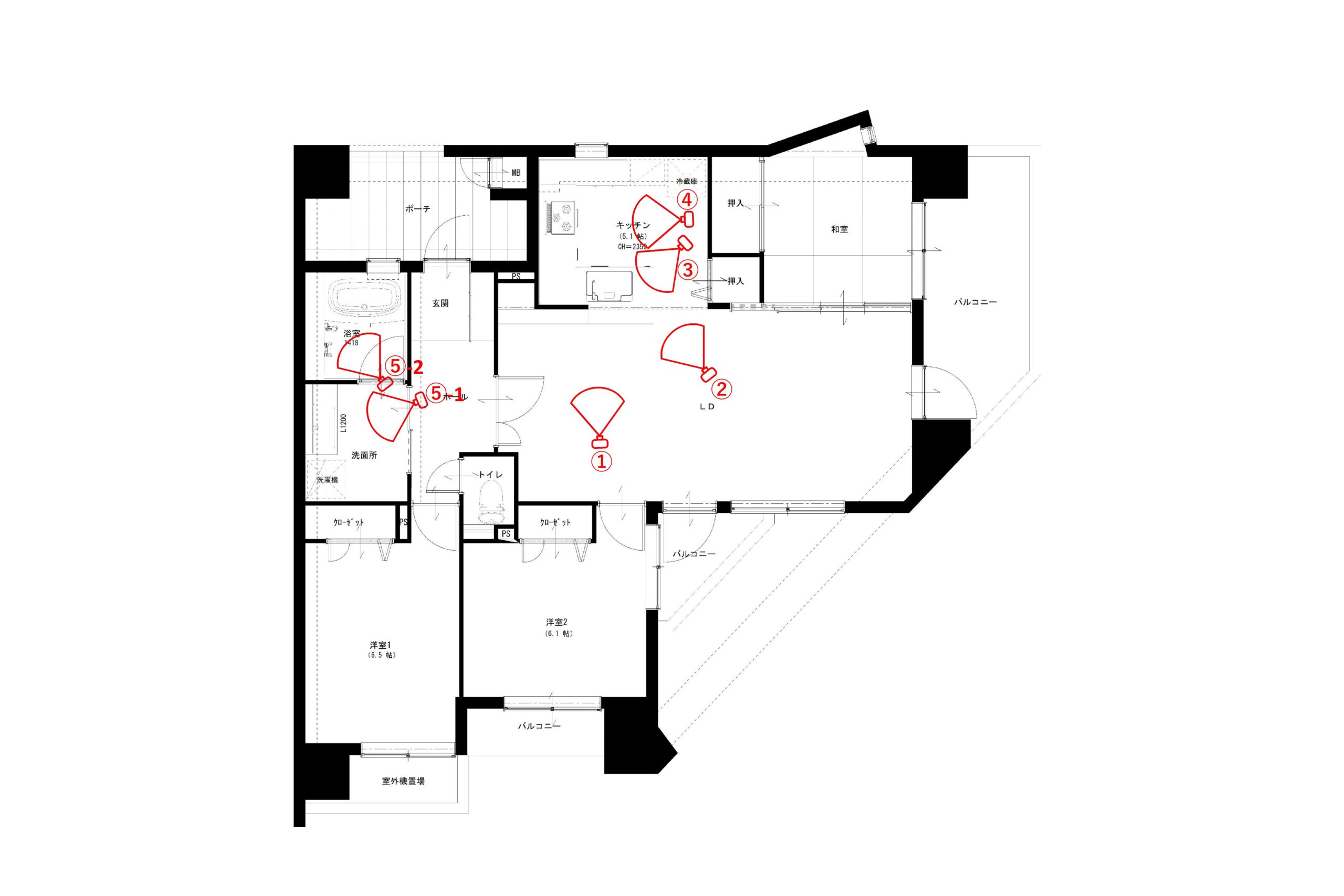 | 使用した設備建材 | 1.キッチン/パナソニック/L-CLASS/ソフトチェリー柄 2.浴室/パナソニック/MR/ツイルネイビー 3.照明器具/パナソニック/LEDダウンライト 4.洗面/パナソニック/ラシス |